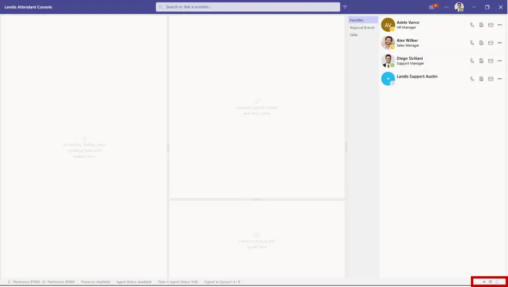When Attendant Console is used as a Contact Center agent, view your current agent status, time in status, and signed-in queue-count in the footer. Click any item for more detailed information without leaving the workspace.