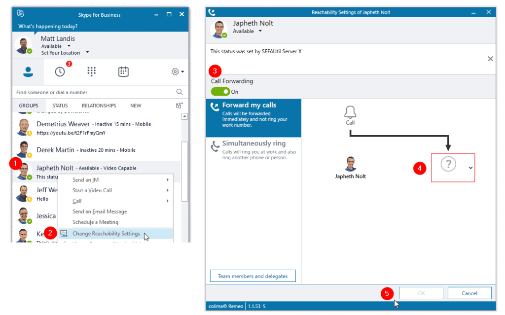 Matt Landis, Managing Owner at Landis Technologies, notes “Colima has a history of making intuitive extensions for Skype for Business Server. Remeo makes it very simple for end users to change forwarding & presence on behalf of others, and significantly, in a user interface that looks just like Skype for Business. Remeo is a simple client application to install that leverages existing install base & community familiarity with Landis SEFAUtil Server with no additional technical dependencies.”