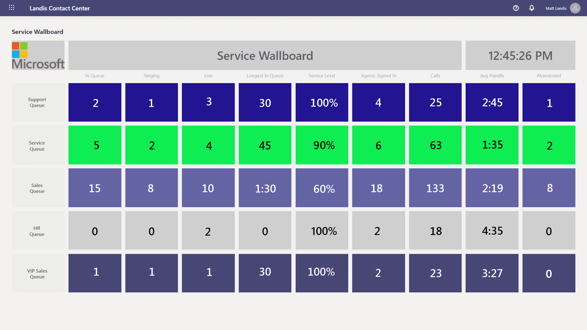 Our customizable dashboards and wallboards provide live insights, giving agents and managers the ability to monitor contact center performance in real time. Wallboards show key live queue stats such as number of calls in queue, active call count, number of agents signed in, number of calls today, abandoned call count and more.