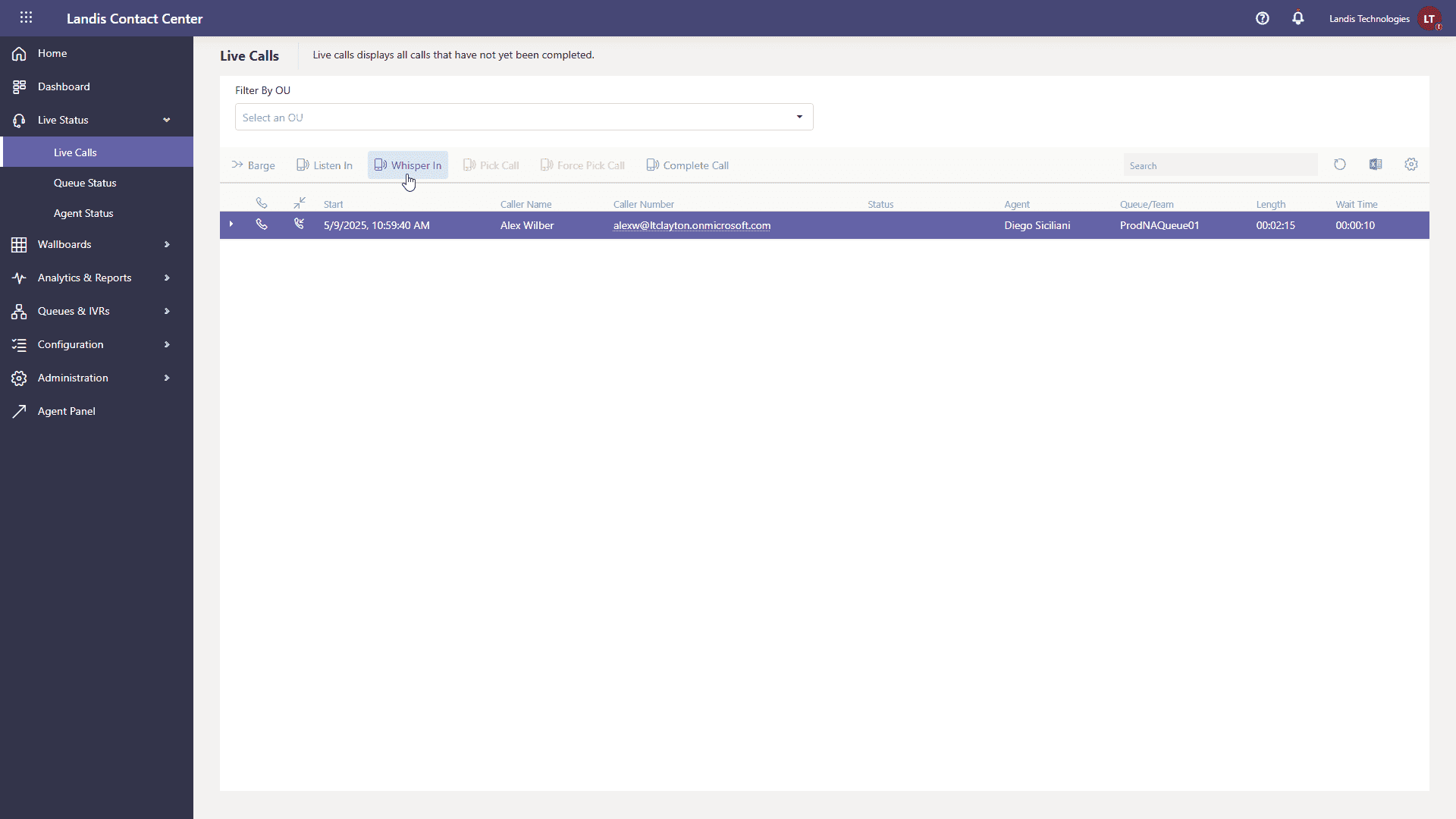 - Whisper In allows managers to join live Queue calls and listen to both the agent and the caller. The manager can only be heard by the agent.