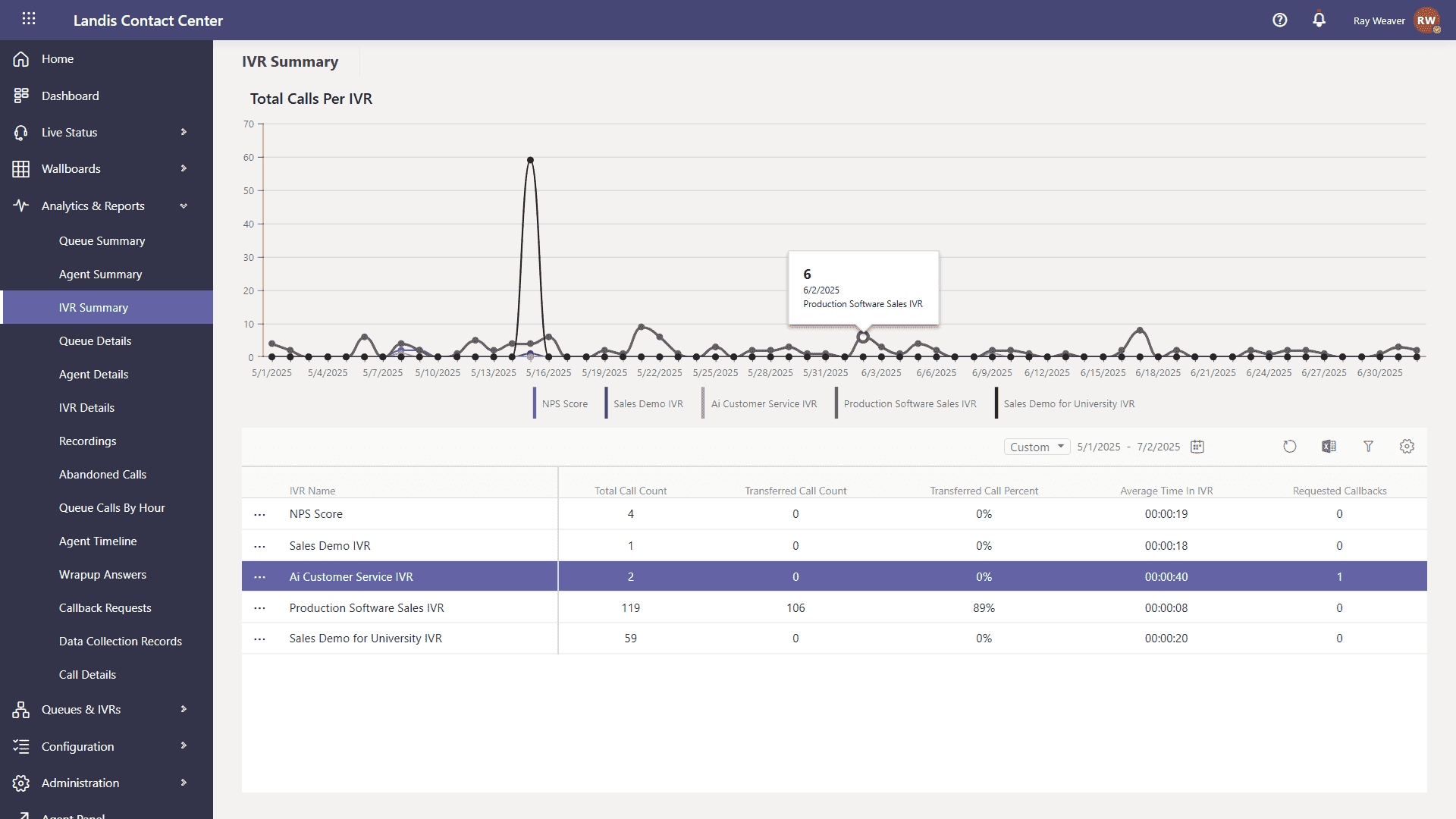 | IVR Summary | Offers historical metrics for every IVR, including total calls and average time callers spent in the IVR. |